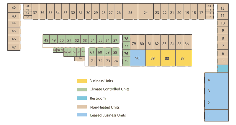 Business Units Business Unit Features: Spaces 87 and 88 Size: 20x20 Ceiling Height: 12 feet Entry: 8 foot roll-up door and key access man door More Info: These business units have a separate meter, an outlet in each unit and restroom access. Business Unit Features: Space 89 Size: 20x20 Ceiling Height: 9 feet Entry: 8 foot roll-up door and key access man door More Info: These business units have a separate meter, an outlet in each unit and restroom access. ![]() |